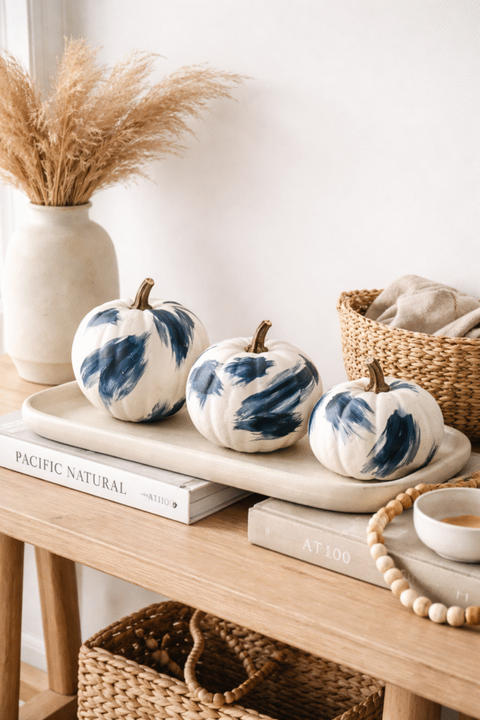 Clustering smaller painted pumpkins adds depth and visual interest to shelves and tables.