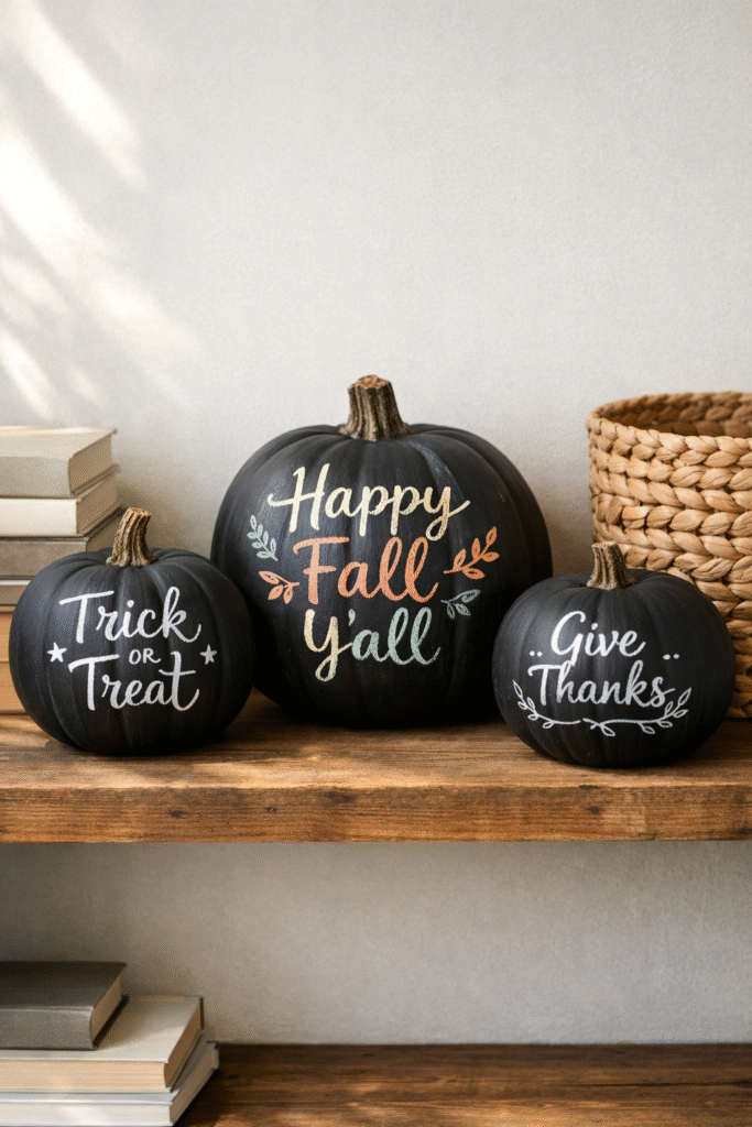 Chalkboard pumpkins feel playful yet customizable. Clean lettering keeps them stylish rather than messy.