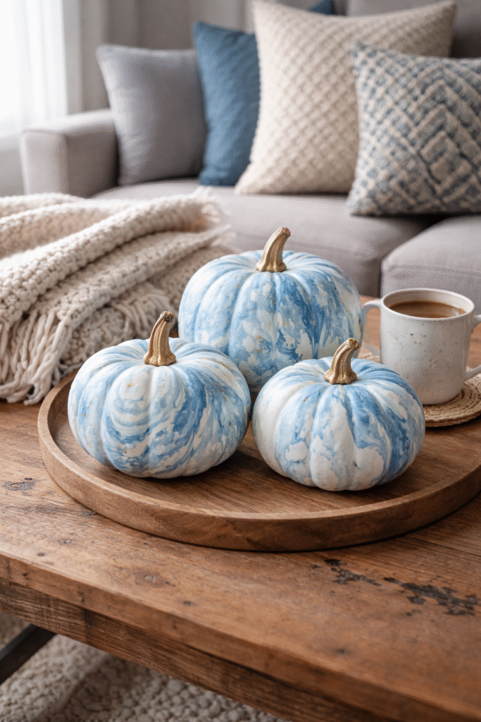 Marble-effect pumpkins look intricate but are surprisingly simple. The swirled patterns feel artistic and elevated.