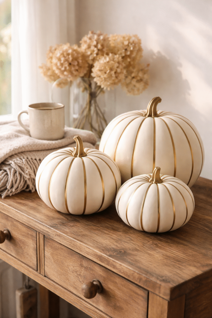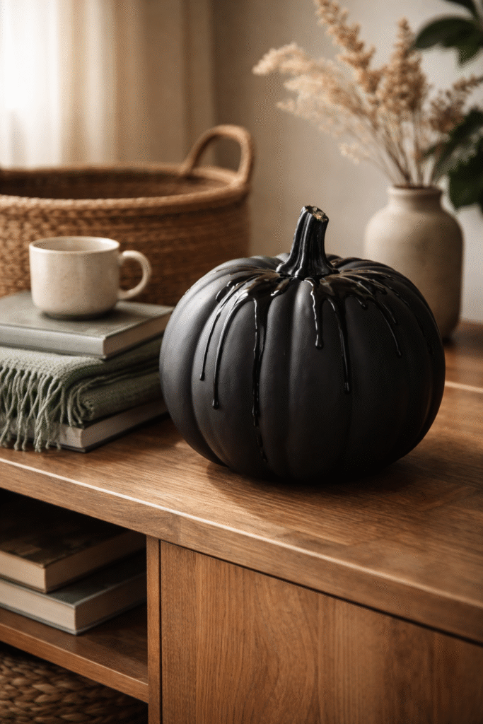 Matte black pumpkins instantly create drama, but adding subtle glossy black drips gives them dimension and sophistication. They feel bold yet refined — perfect for a modern aesthetic living space.