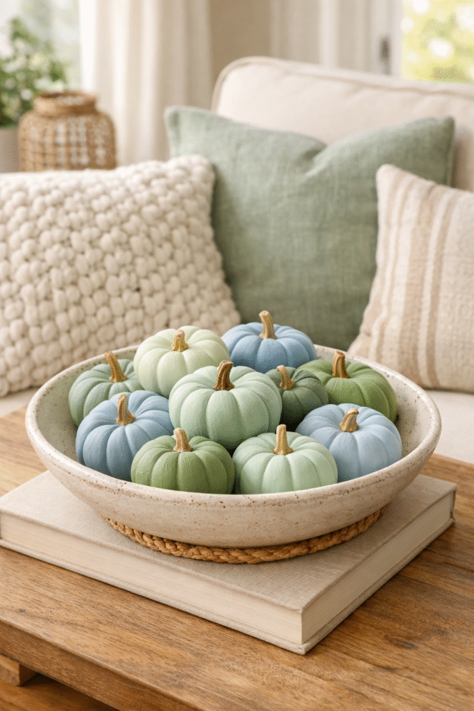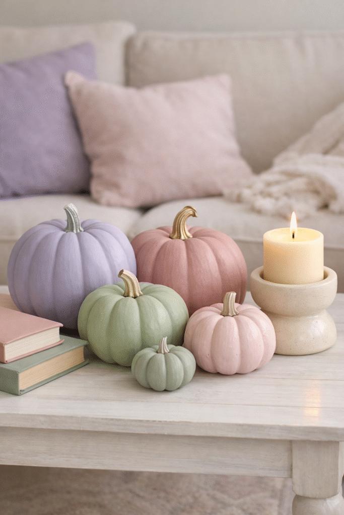 Paint pumpkins in coordinated pastel tones and group them in odd numbers for balance.