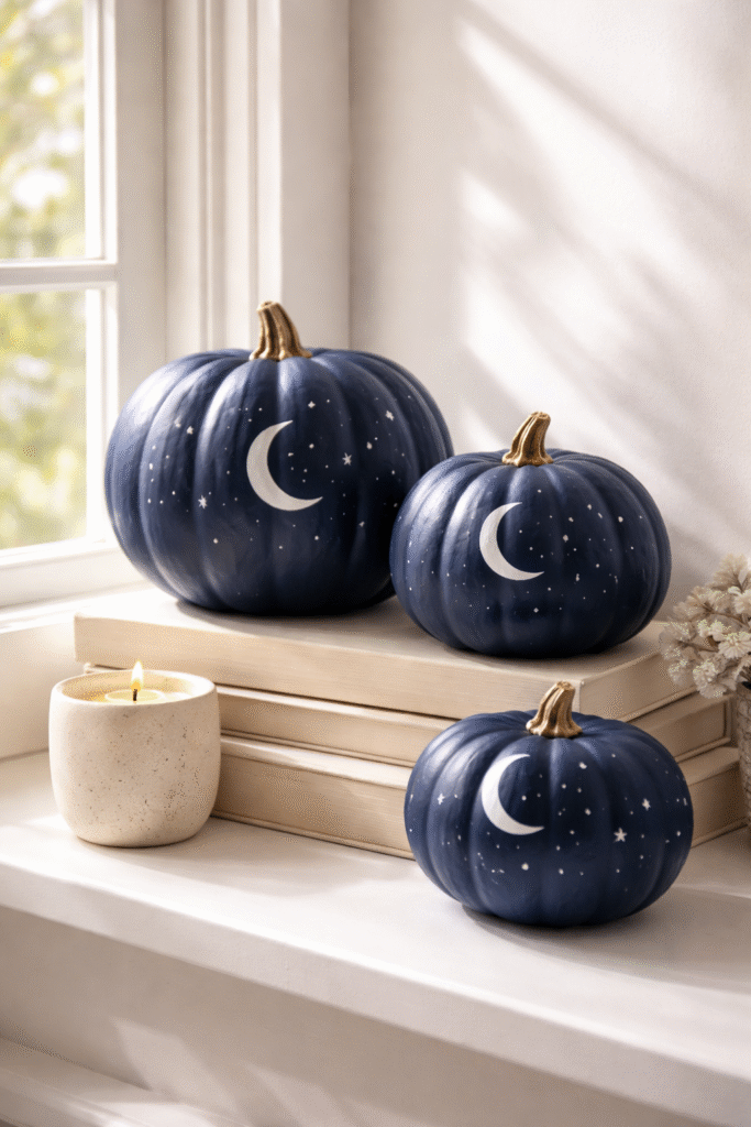 Paint pumpkins navy and use a fine white paint pen to draw minimal celestial shapes.