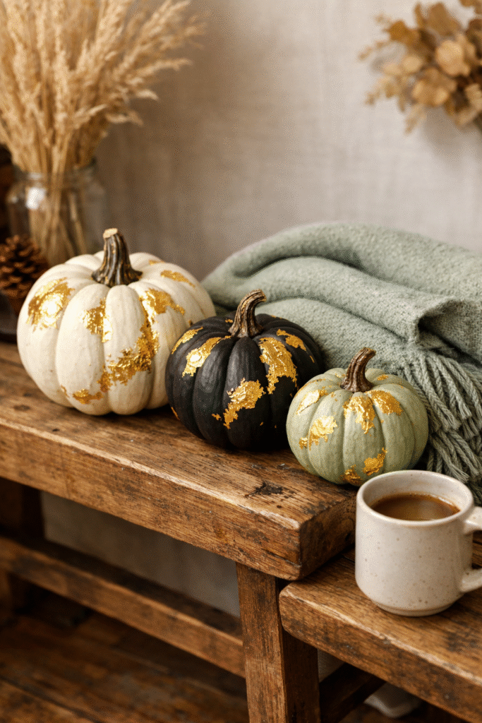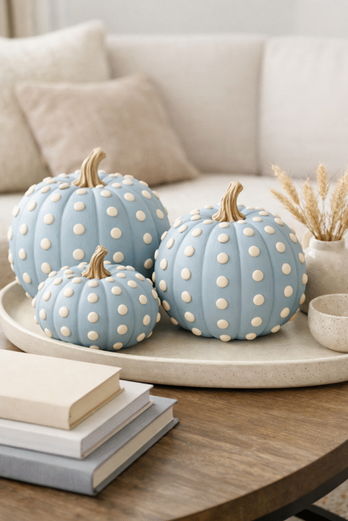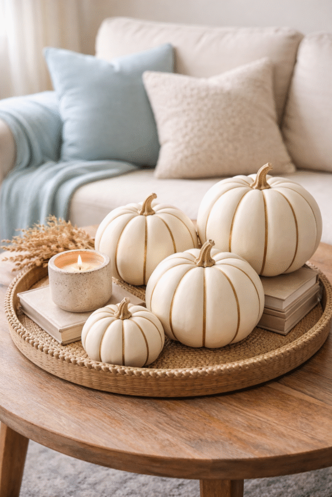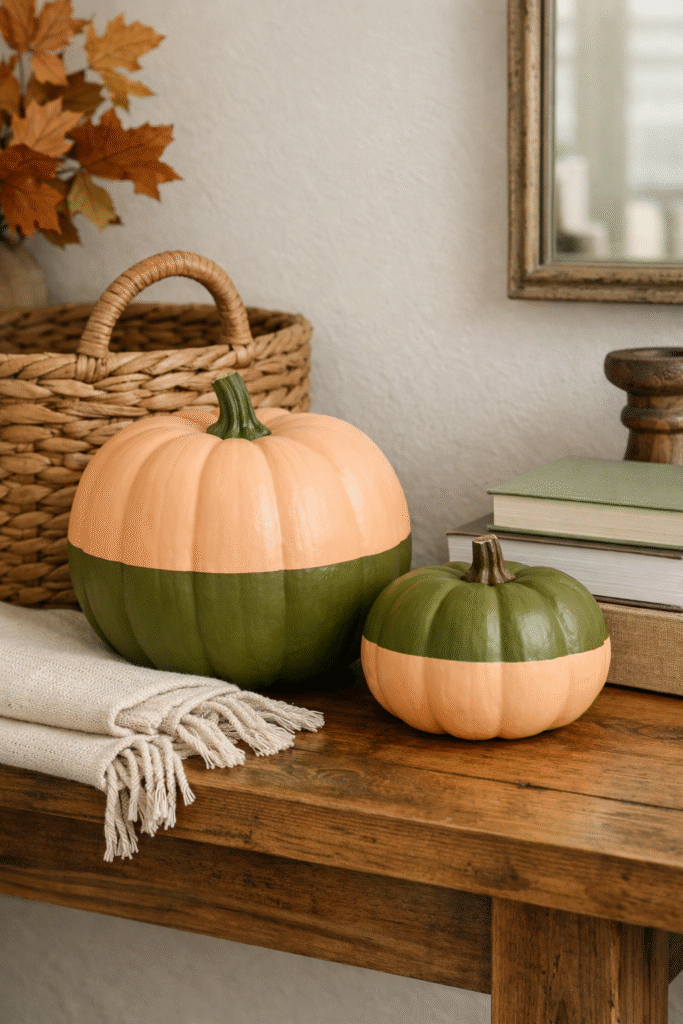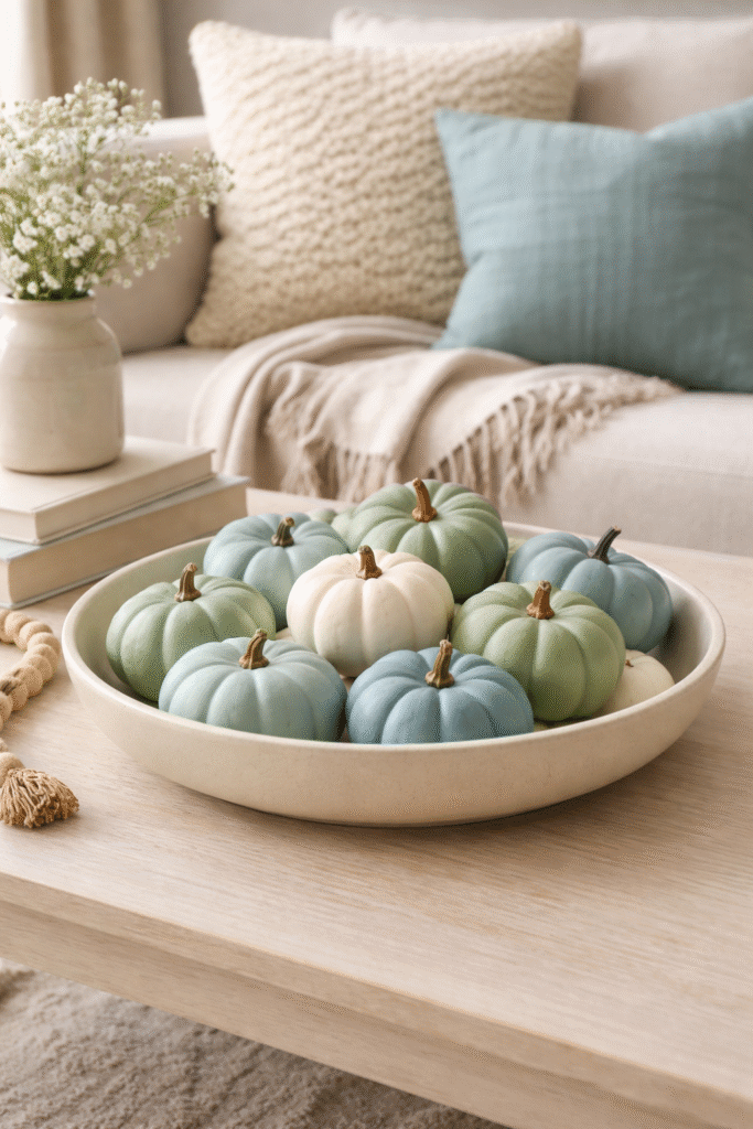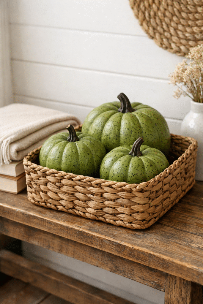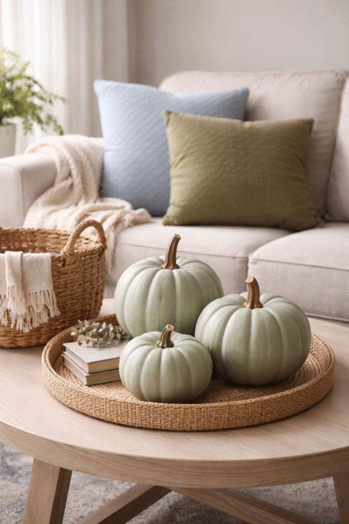 Sage green pumpkins feel grounded and modern. They blend beautifully into neutral interiors while still adding a clear seasonal touch.