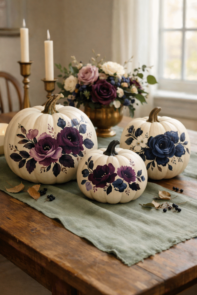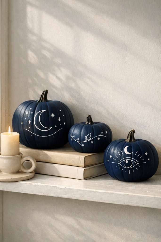 Deep navy pumpkins add drama without relying on black. When decorated with thin white line art — moons, stars, or abstract shapes — they feel artistic and elevated.
