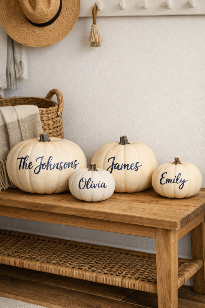 Use a fine paint pen in navy or muted terracotta to write names neatly across neutral pumpkins.