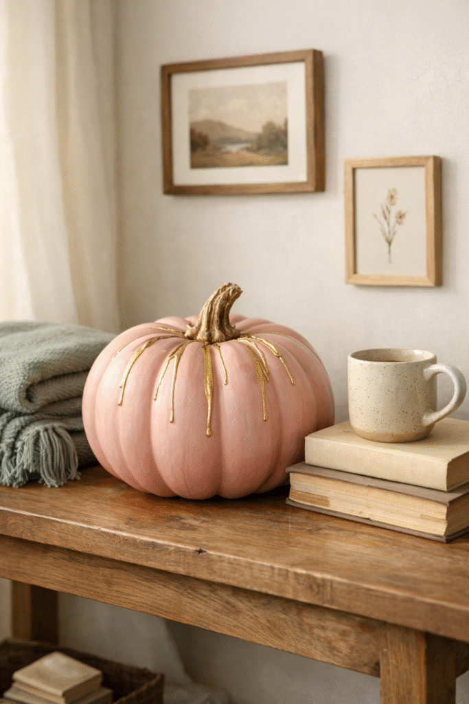Paint your pumpkin dusty rose or blush. Once dry, lightly drizzle metallic gold paint from the top and let it flow naturally. Keep the drips minimal for a refined finish.