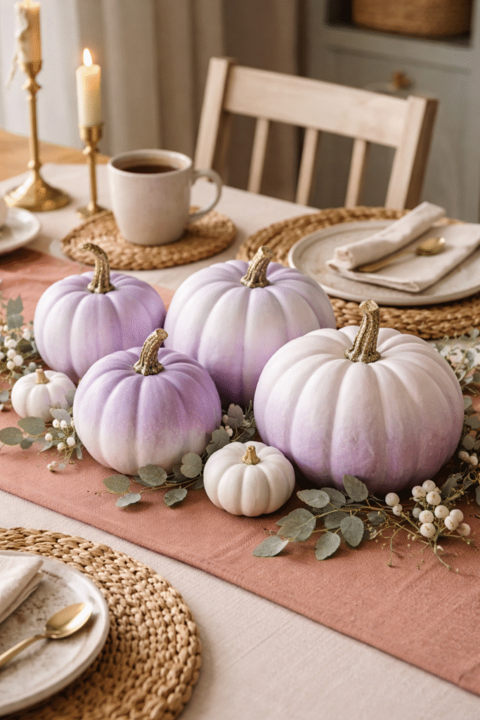 Lavender, dusty rose, and sage pumpkins create a lighter Halloween aesthetic that blends with modern home decor trends.