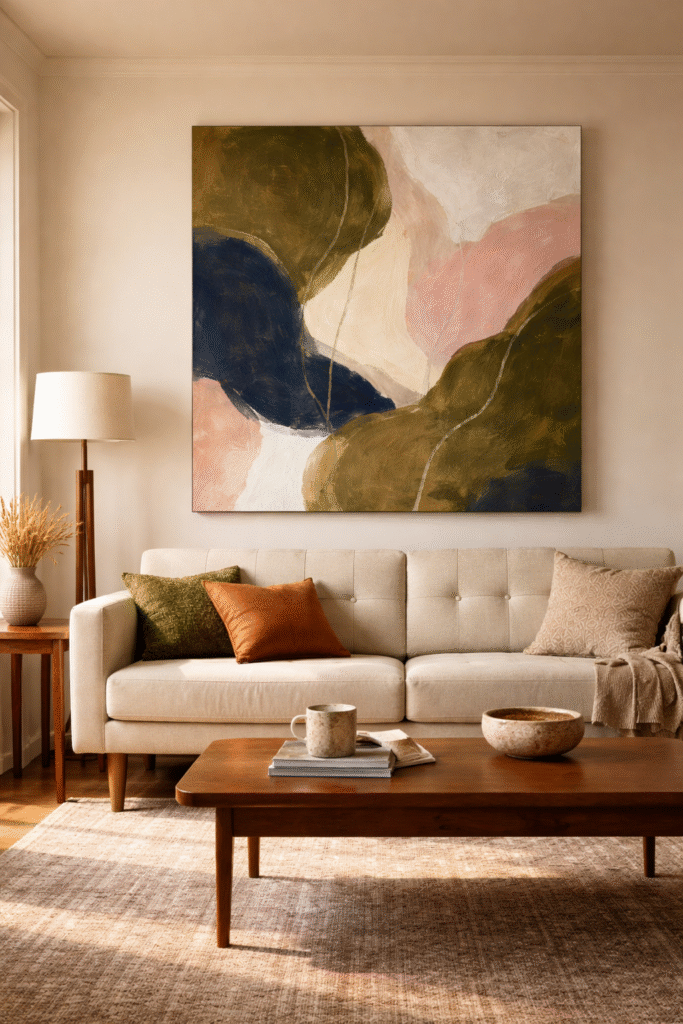 Oversized abstract art is a powerful way to modernize a mid century living room while increasing perceived value. It anchors the wall and draws the eye upward.