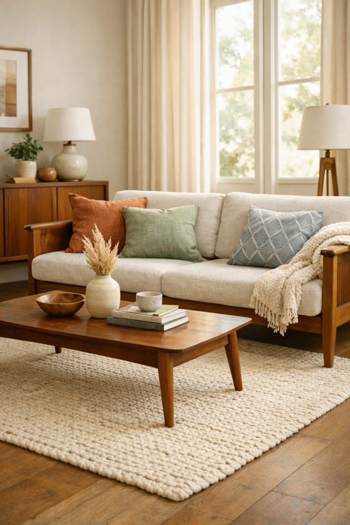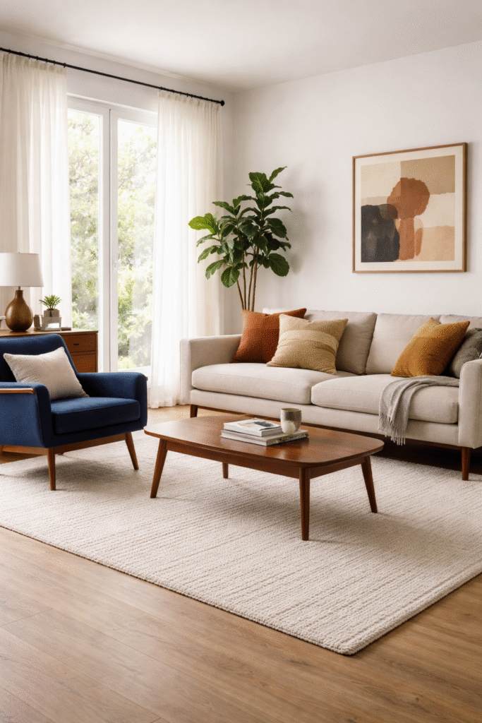 Nothing defines a mid century living room quite like sculptural seating with tapered legs and clean lines. A low-profile sofa in a soft neutral or muted olive instantly creates a polished, architectural look.