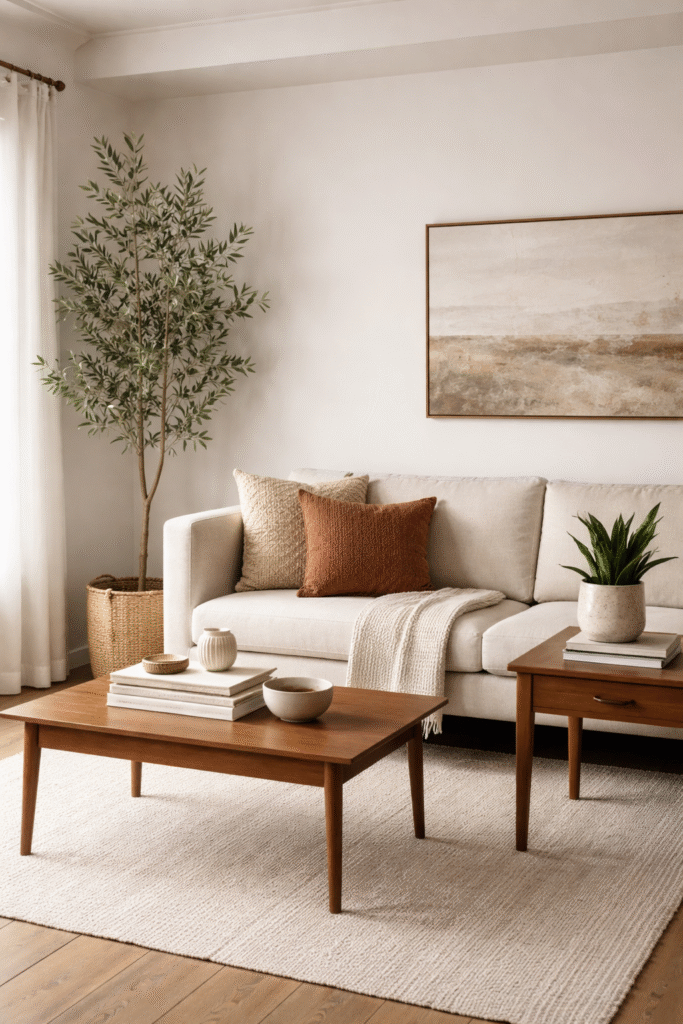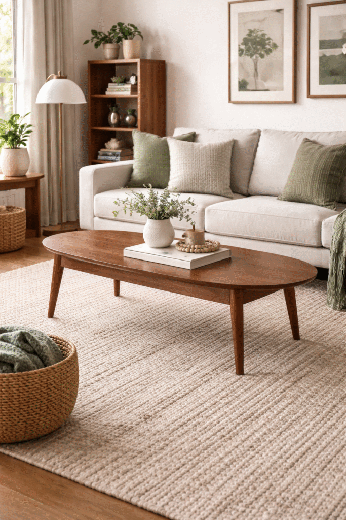 Mid century design celebrates wood — but in a balanced, refined way. Think walnut coffee tables, slim media consoles, and open shelving.