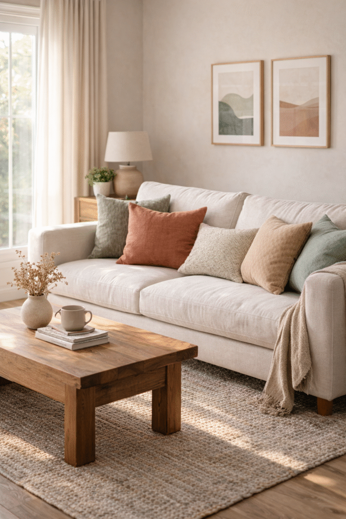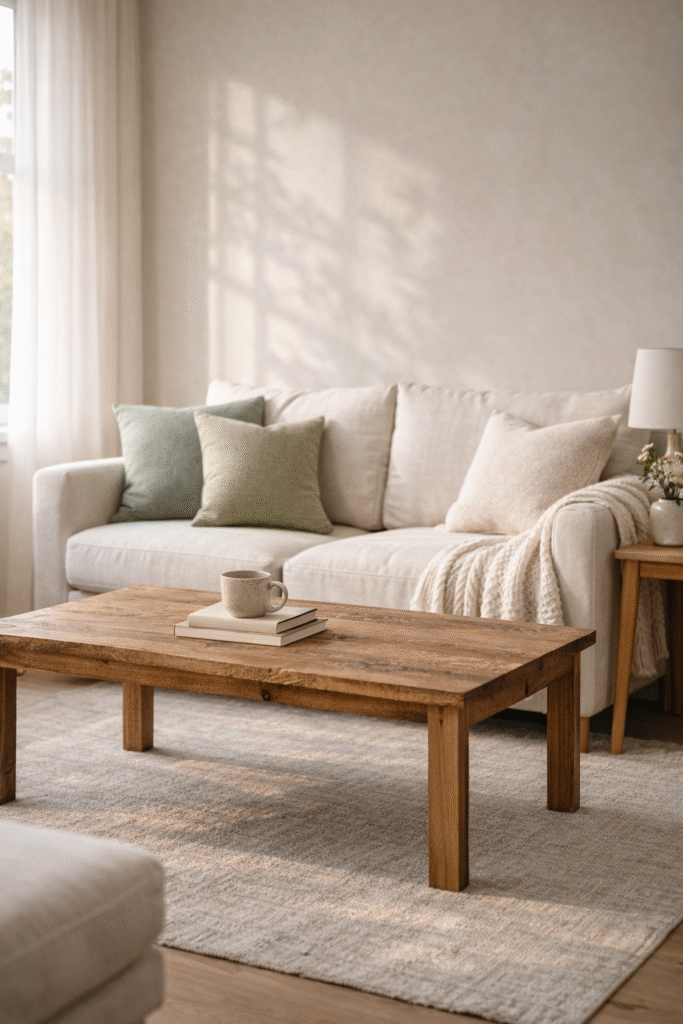 Look for a rectangular or round table with minimal legs. Pair it with a neutral sofa and soft textured cushions in sage or soft blue for balance.