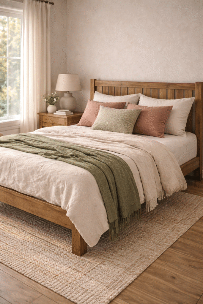 Layer pillows in muted tones like dusty rose and olive for subtle contrast.