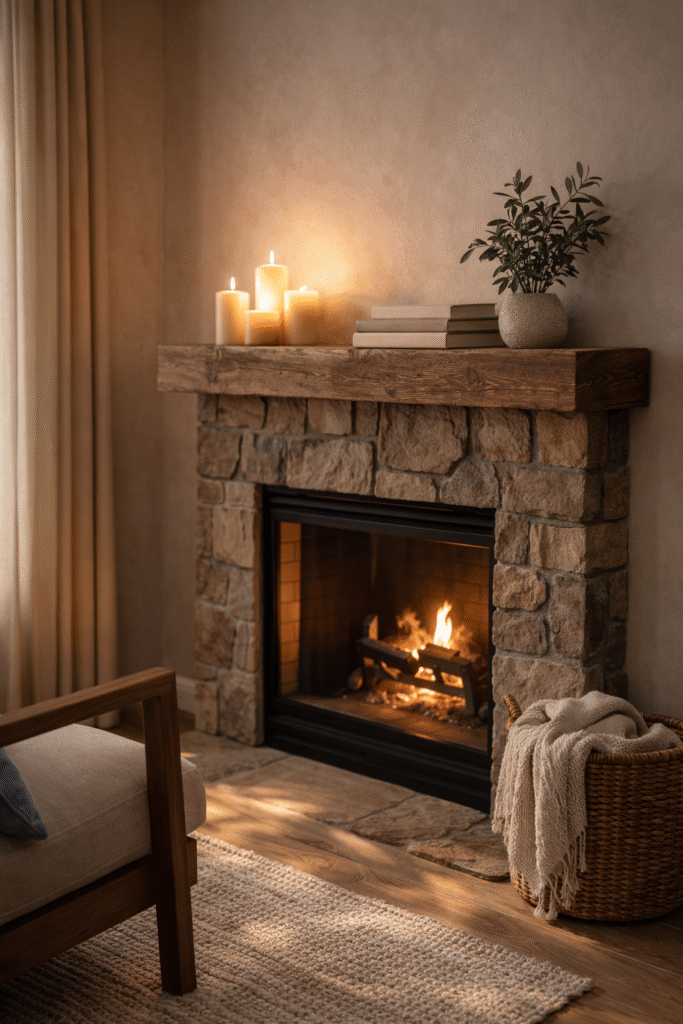 Decorate with layered candles, simple greenery, and a few stacked books. Avoid overcrowding.