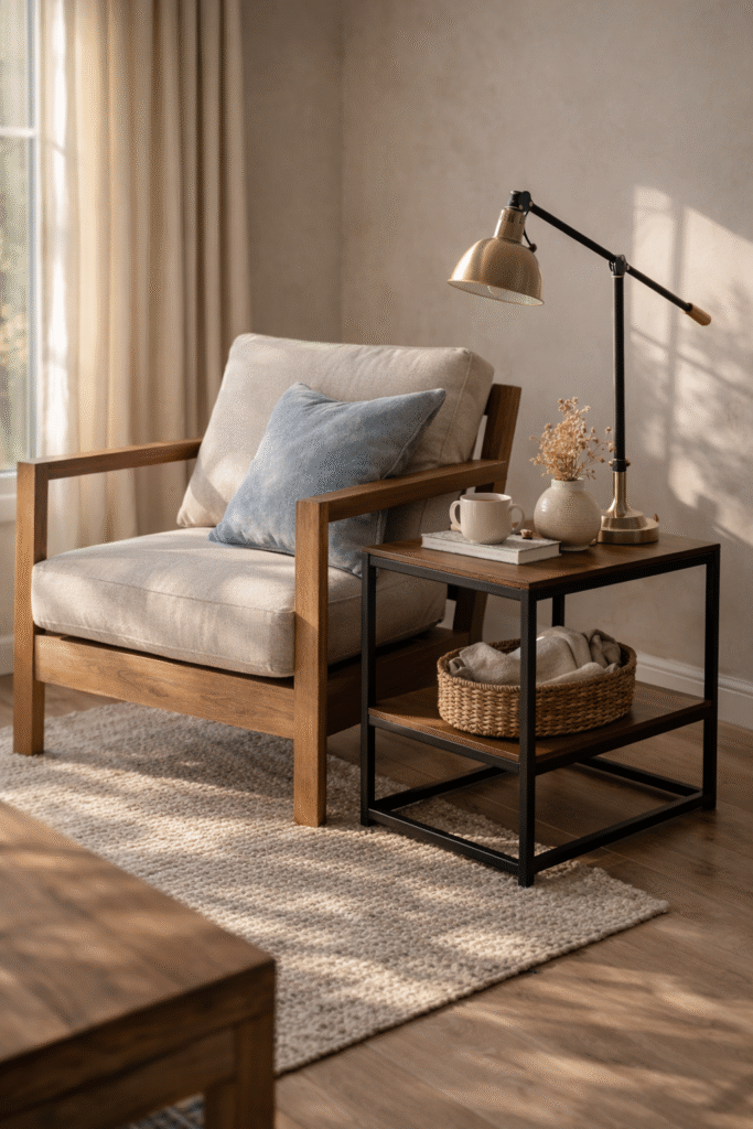 Try metal-framed side tables, lighting fixtures, or shelving paired with wooden surfaces for balance.
