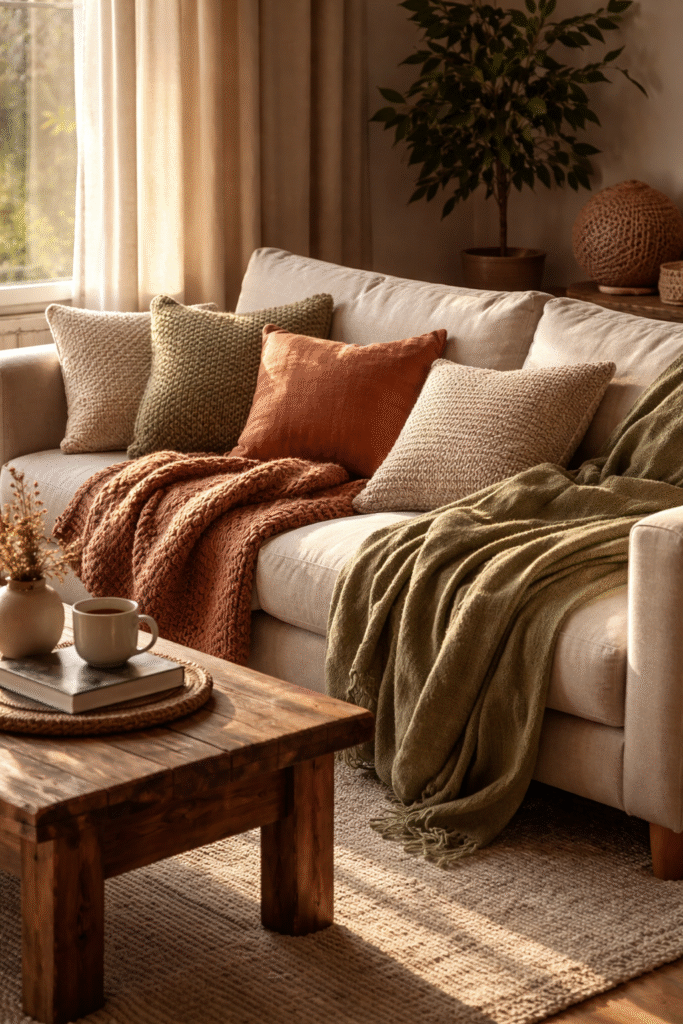 Layer different fabrics in muted terracotta, olive, or dusty rose tones. Keep the palette cohesive to maintain a calm aesthetic.