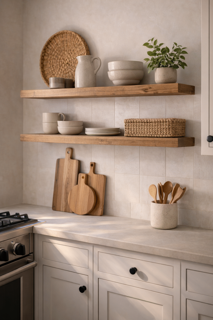 Open shelves create an airy, modern feel while showcasing rustic ceramics and wooden boards.