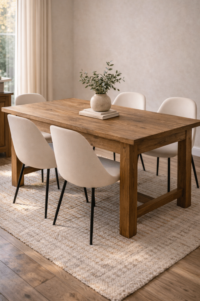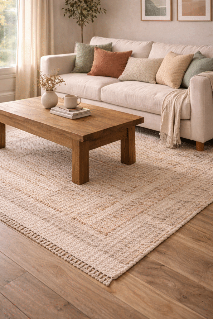 A rug anchors the room and softens wooden floors. Choose woven or lightly patterned designs in neutral tones.