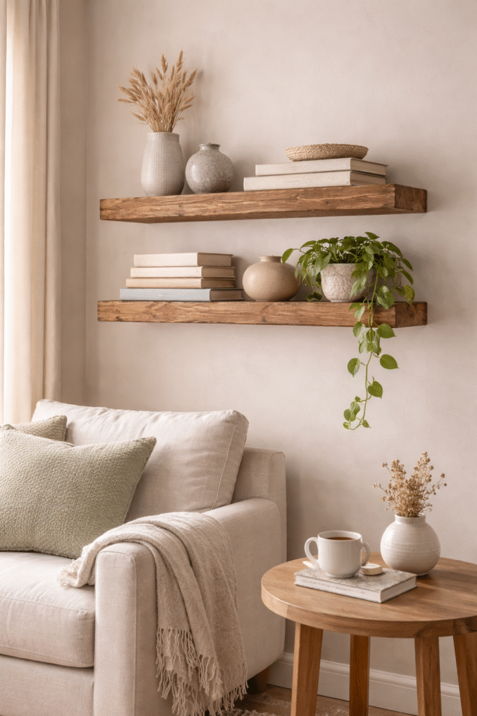 Floating wood shelves combine modern minimalism with rustic warmth. They add vertical interest while remaining functional.