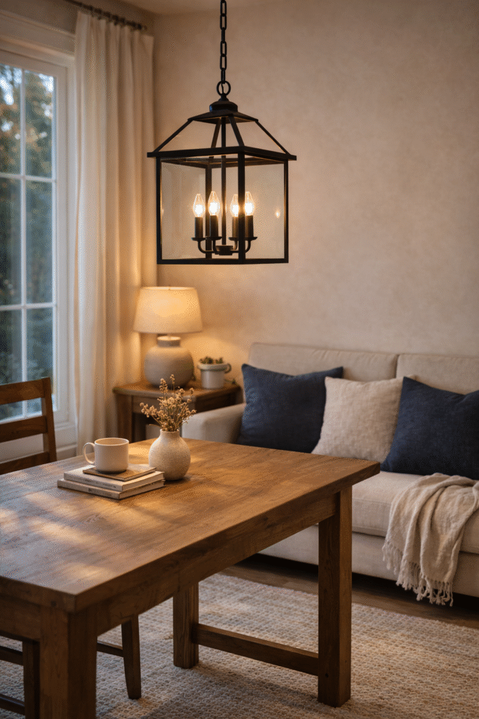 Lantern-style pendants or black metal chandeliers add rustic character while keeping lines clean.