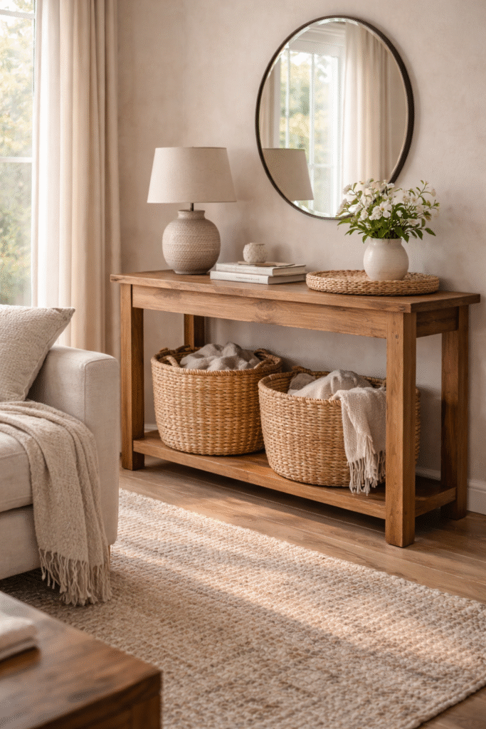 Storage can double as decor. Woven baskets add texture while hiding clutter.