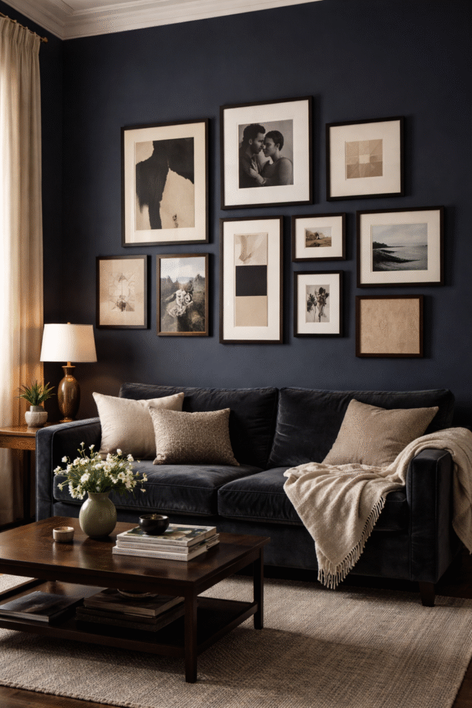 A gallery wall against a deep background feels curated and dramatic. It adds personality without clutter.