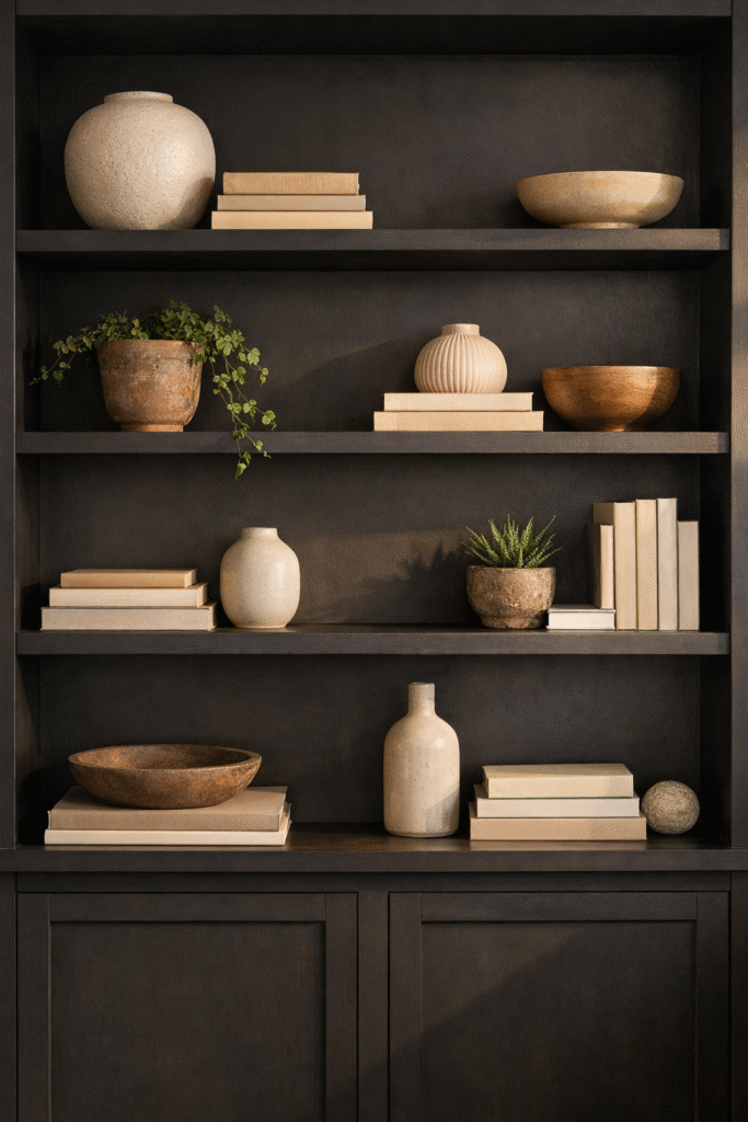 Dark built-ins create beautiful contrast and depth. Layer books, ceramics, and greenery thoughtfully.