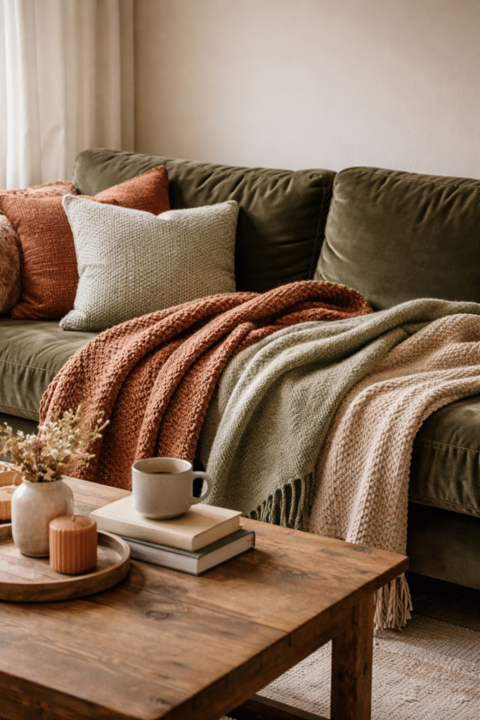 Layering throws in complementary tones adds dimension and approachability.
