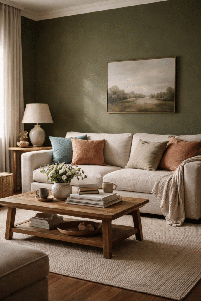 Choose a muted olive rather than a neon shade. Pair it with cream sofas, warm wood, and soft blue or dusty rose accents to keep balance.