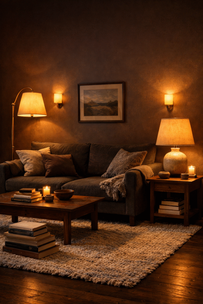 Combine a floor lamp, table lamp, and subtle wall sconces. Use warm white bulbs to maintain a cozy glow.