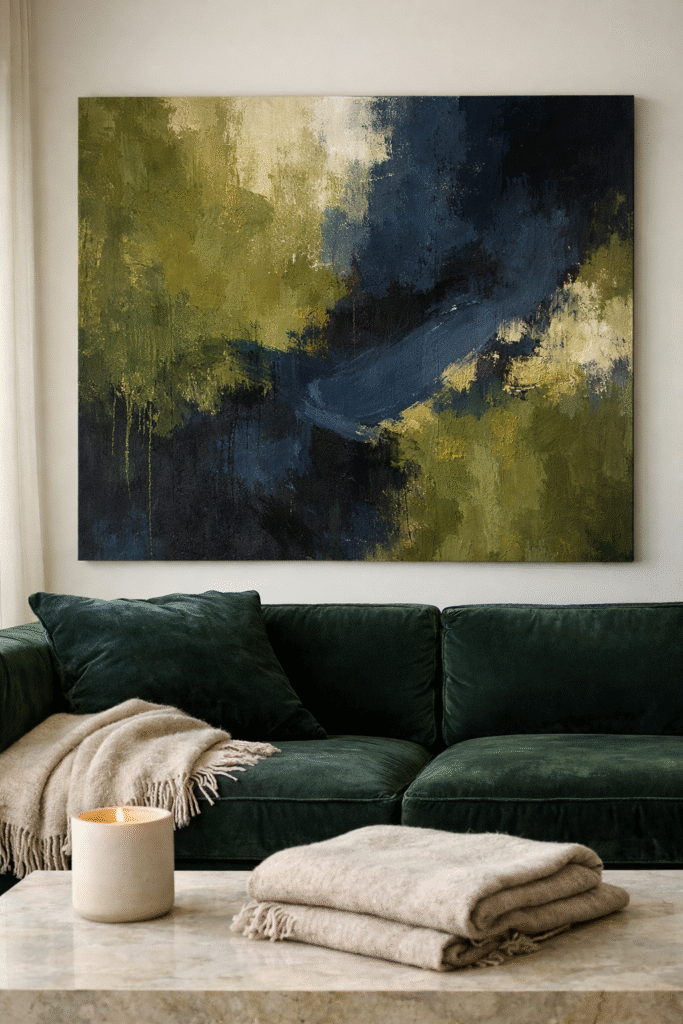 Large-scale art anchors the room and increases perceived value. It draws the eye upward and adds sophistication.
