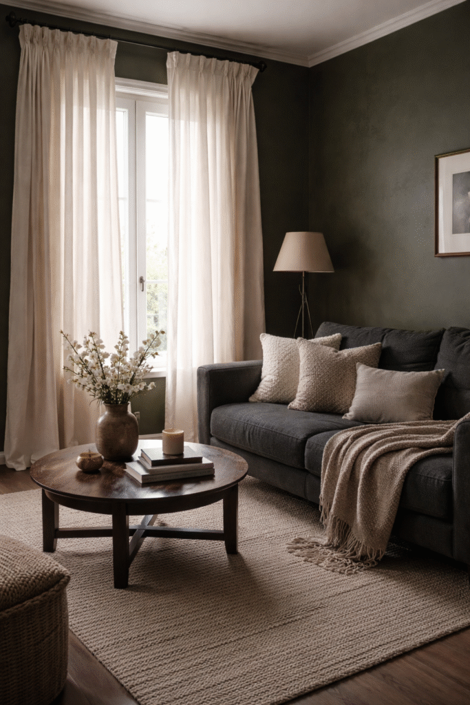 Light linen curtains soften moody tones and allow gentle light to filter through.