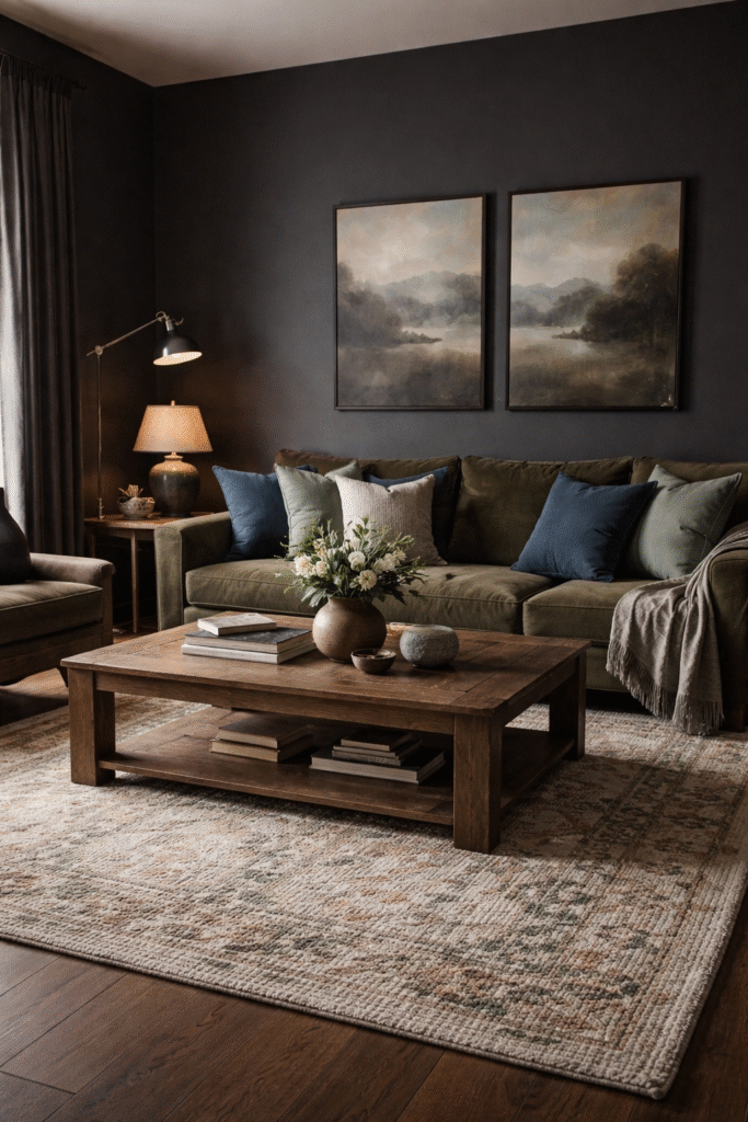 A thick woven or patterned rug softens dark walls and prevents the room from feeling heavy.