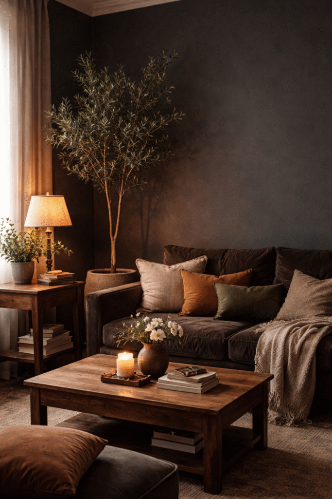 Plants soften dramatic tones and bring life into the room. They balance the richness of dark walls.