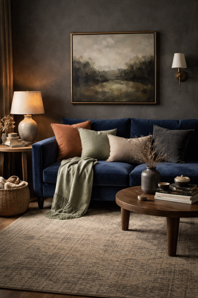 A velvet sofa in navy, forest green, or deep plum instantly elevates the mood. The fabric catches light softly and adds luxurious texture.