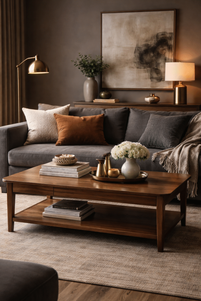 Choose one statement wood piece like a coffee table and echo brass in small accents.