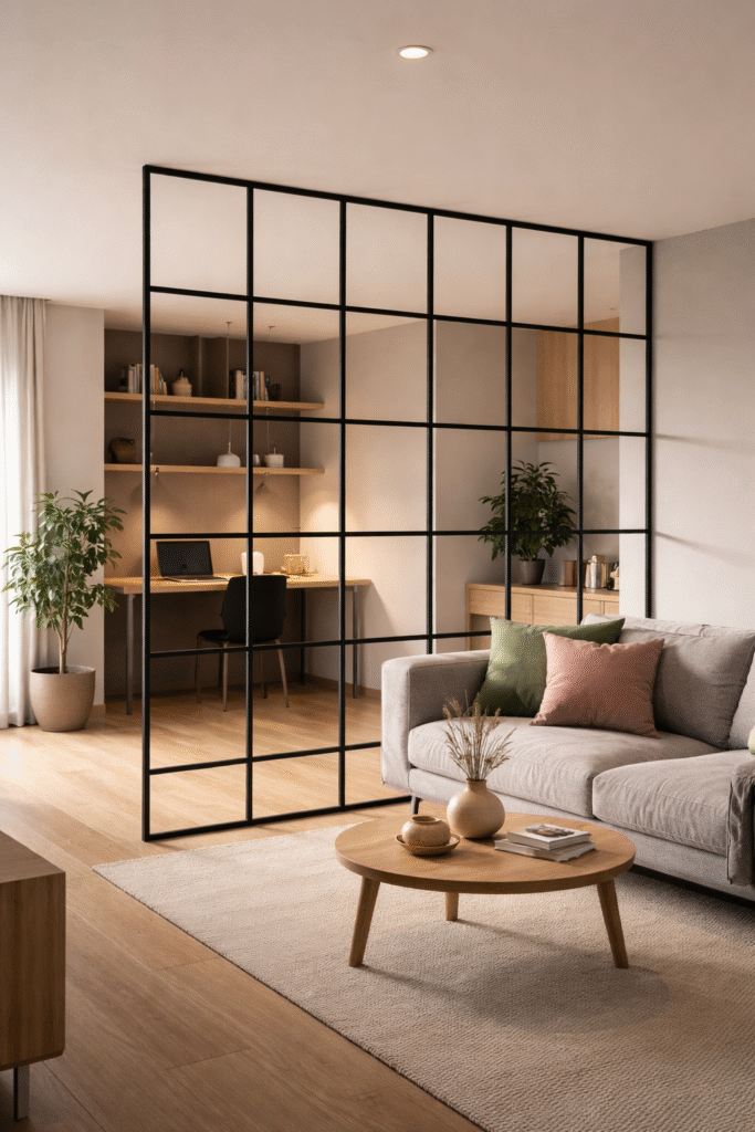 A slim metal grid partition creates visual separation while maintaining openness. It works beautifully in modern homes.
