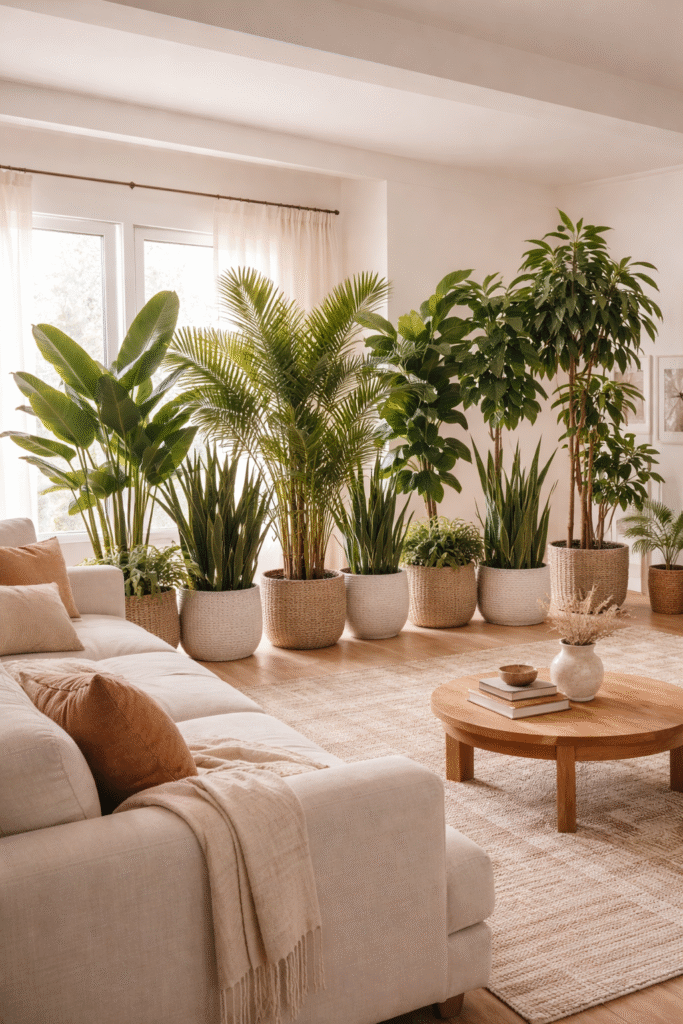 Tall plants arranged in a row create a soft, natural boundary. The greenery adds freshness and cozy interior inspiration.