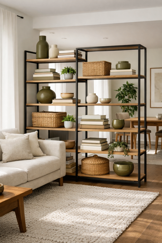 An open bookshelf acts as both a divider and a styling opportunity. It creates subtle separation without blocking light.