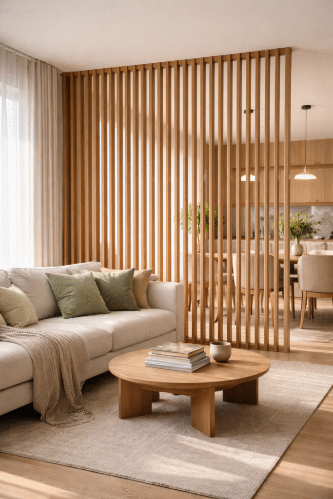 Vertical wooden slats create separation while still allowing light to pass through. The effect feels architectural, clean, and cozy at the same time.